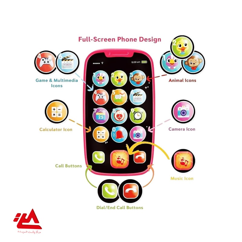 دکمههای موزیکال و تعاملی: دارای دکمههایی با صداهای مختلف که شامل آهنگهای جذاب و افکتهای صوتی متنوع شامل صدای تماس، شماره گیری و بوق تلفن، صدای سه حیوان، صدای تیک تاک ساعت، صدای ضربان قلب، صدای عکس گرفتن و صدای دست و هورا است.
